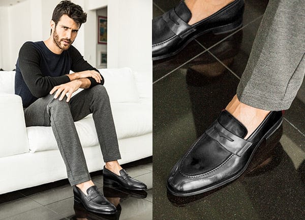 Black penny loafer Italian leather dress shoes. The Greg penny loafer dress shoes in Black Antique is hand-crafted from premium Italian leather and features a traditional apron toe. All Ace Marks shoes have a durable blake flex construction with hard-wearing leather soles. This timeless favourite makes an enduring edition to the footwear collection of the modern gentleman. The Penny Loafer Greg Black Antique is versatile in its understated elegance and traditional design. It works on multiple levels with a tailored suit or a pair of chinos to exude traditional finesse. All Ace Marks models are shipped without charge to the United States and are eligible for our Buyback program.