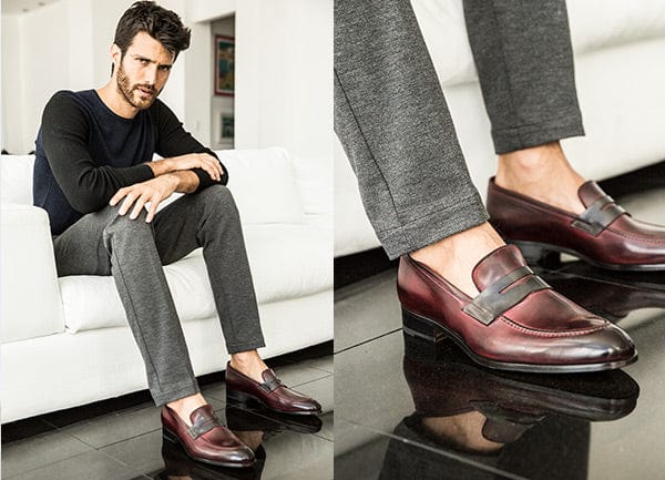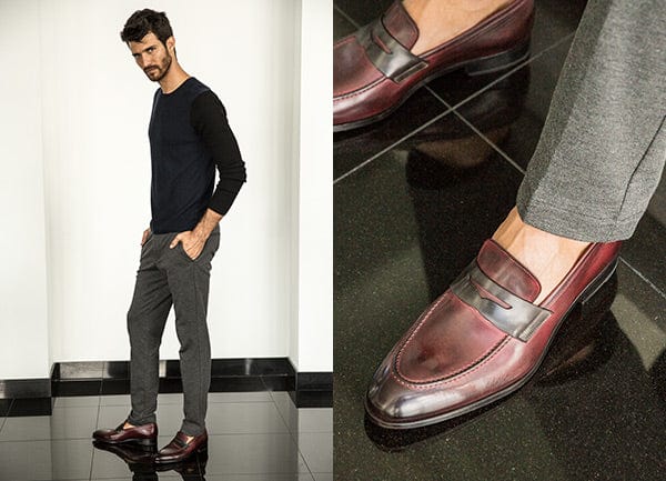 The Greg penny loafer dress shoes in Diablo Antique and Dark Grey Leather is made from premium Italian leather and offers luxurious texture in its elegant shape. Our Diablo can be most similarly compared to an oxblood or merlot color.