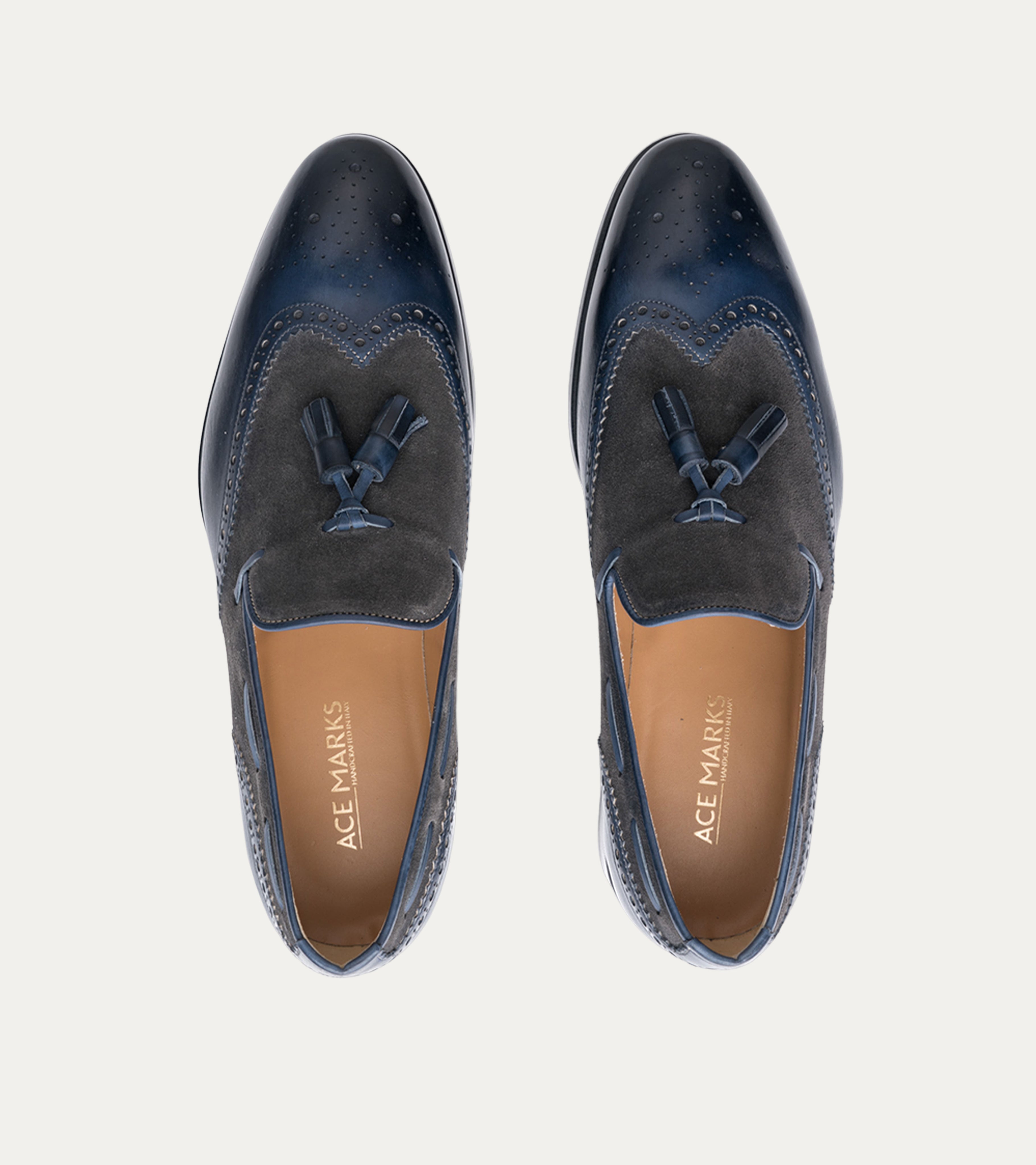 The Kevin is a Wingtip Tassel Loafer in Blue Antique and Grey Suede. It is handcrafted in Italy by our 4th generation family of artisans and master craftsmen. The upper is made of full-grain Italian calf-skin leather with a luxurious texture. All Ace Marks shoes benefit from a durable blake flex construction with hard-wearing leather soles. With a comfortable slip-on design, this model adds a touch of class to any outfit inside and outside of the office. It exudes smart style and effortless sophistication. All Ace Marks models are shipped without charge to the United States and are eligible for our Buyback program.